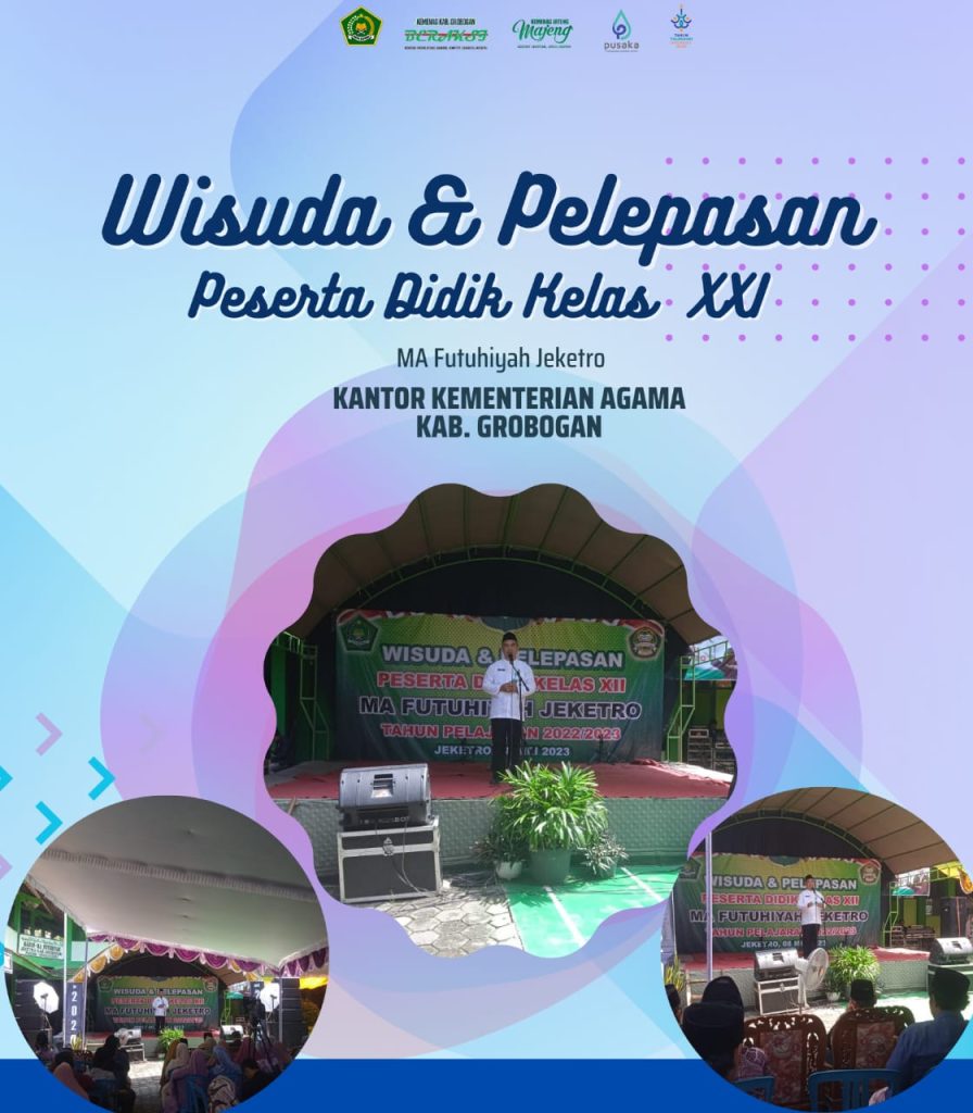 RILISJATENG.COM– Madrasah Aliyah Futuhiyah Jeketro Kab. Grobogan menggelar acara wisuda siswa kelas 12 hari Senin, 08 Mei 2023 bertempat di halaman MA Futuhiyah Jeketro. Sebanyak 80 siswa kelas 12 mengikuti rangkaian kegiatan wisuda dari awal hingga akhir. Dalam acara wisuda tersebut dihadiri oleh Kepala Kantor Kemenag Kabupaten Grobogan Fahrur Rozi.